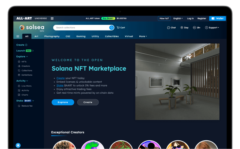 The use of $AART covers various functions, such as reducing trade fees, staking for better visibility on our platforms, and activating special features. In SolSea, our Open NFT marketplace, these are just a few examples of its diverse applications.