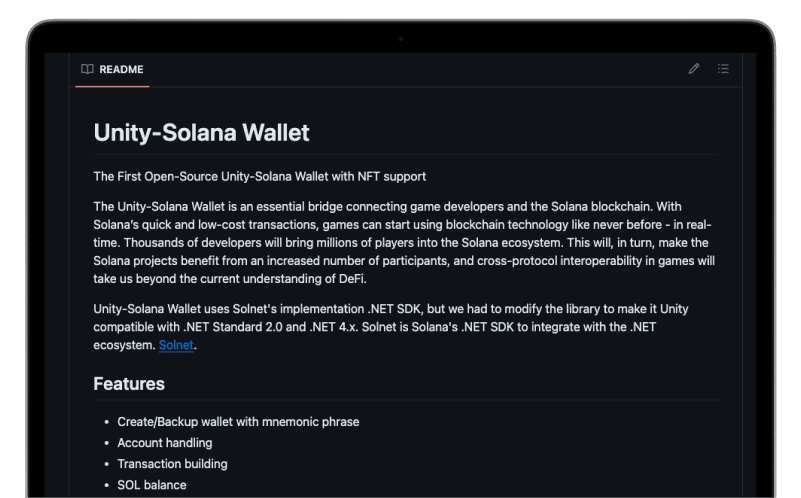 Community Contribution: Our open-source Unity Solana Wallet allows integration of the Solana blockchain into Unity projects.